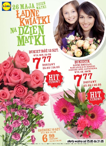 {loadposition linkLidl} Nowa gazetka promocyjna Lidl - "Ładne kwiatki na Dzień Matki". Polecane promocje z gazetki Lidl: Bukiet róż 13 sztuk - 7,77 zł. Goździki 10 sztuk - 6,99 zł. Frezje 10 sztuk - 9,99 zł. Akcje promocyjne…