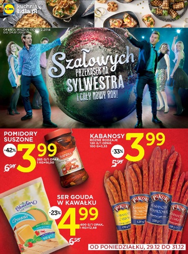{loadposition linkLidl} Nowa gazetka promocyjna Lidl - "Szałowych przekąsek na sylwestra i cały nowy rok!". Polecane promocje z gazetki Lidl: Pomidory suszone 285 g - 3,99 zł. Ser Gouda w kawałku 400 g - 4,99 zł. Kabanosy Pikok 120…
