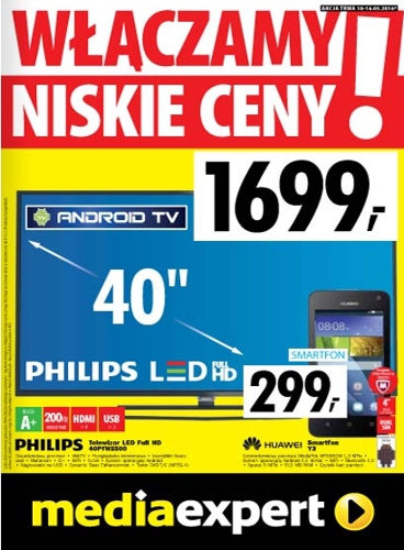 {loadposition linkMediaExpert} Nowa gazetka promocyjna Media Expert - "Włączamy niskie ceny!". Polecane promocje z gazetki Media Expert: Telewizor LED 40" PHILIPS 40PFH5500 - 1699 zł. Smartfon HUAWEI Y3 - 299 zł. Telewizor LED 32" SHARP LC-32CHE5100E - 999 zł.…