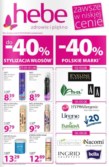 {loadposition linkHebe} Nowa gazetka promocyjna drogerii Hebe". Polecane promocje z gazetki Hebe: Lakier do włosów Taft 250 ml - 8,39 zł. Pianka do włosów Wella Wellaflex 200 ml - 9,79 zł. Guma stylizująca do włosów GOT2B Chaotic 100 ml…