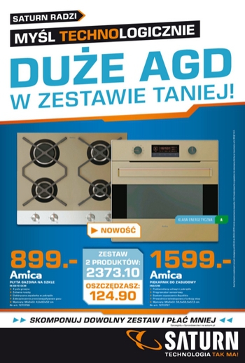 {loadposition linkMediaMarkt} Nowa gazetka promocyjna Saturn - "Duże AGD w zestawie taniej!". Polecane promocje z gazetki Saturn: Płyta gazowa na szkle Amica IN 6610 GCM - 899 zł. Piekarnik do zabudowy Amica IN622M - 1599 zł. Płyta indukcyjna Beko…