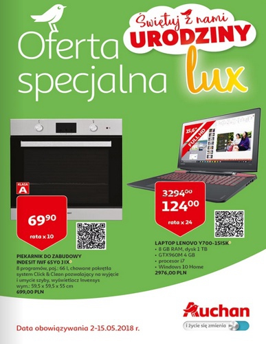 {loadposition linkAuchan} 'Świętuj z nami urodziny - oferta specjalna lux' - nowa gazetka promocyjna sieci marketów Auchan. Polecane promocje z gazetki Auchan: Piekarnik do zabudowy Indesit IWF 65YOJIX - 699 zł. Laptop Lenovo Y700-15ISK - 2976 zł. Zmywarka stołowa…