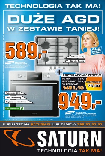 {loadposition linkMediaMarkt} Nowa gazetka promocyjna Saturn - "Duże AGD w zestawie taniej!". Polecane promocje z gazetki Saturn: Płyta gazowa SAMSUNG GN642FFXD - 589 zł. Piekarnik SAMSUNG BF1OC4T212 - 949 zł. Okap GORENJE DVG 600 B2 - 1199 zł. …