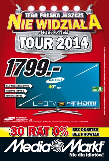 {loadposition linkMediaMarkt} Nowa gazetka promocyjna Media Markt - "Tego Polska jeszcze nie widziała. Media Markt Tour 2014". Polecane promocje z gazetki Media Markt: Telewizor LED 3D 40" SAMSUNG UE40F6320 - 1799 zł. Piekarnik do zabudowy SMEG SF 390X -…