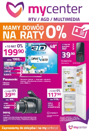 Nowa gazetka promocyjna sieci sklepów MyCenter. Polecane promocje z gazetki MyCenter: Telewizor LED 3D 48" PANASONIC TX-48AS640E - 1999 zł. Lodówka INDESIT BIAA13P F - 1179 zł. Pralko-suszarka LG F12A8CD - 2299 zł (smartfon LG w prezencie). Piekarnik…