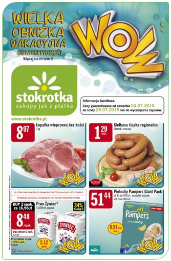 Nowa gazetka promocyjna sieci handlowej Stokrotka - "Wielka obniżka wakacyjna". Polecane promocje z gazetki Stokrotka: Łopatka wieprzowa bez kości 1 kg - 8,97 zł. Kiełbasa śląska regionalna 100 g - 1,29 zł. Pieluchy Pampers Giant Pack - 51,44…