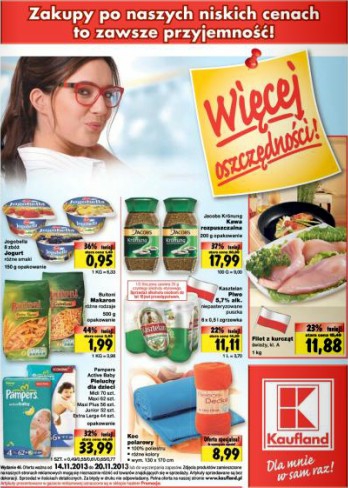 {loadposition linkKaufland} Nowa gazetka promocyjna marketu Kaufland - "Więcej oszczędności!". Polecane promocje z gazetki Kaufland: Filet z kurcząt 1 kg - 11,88 zł. Pieluchy Pampers Active Baby - 33,99 zł. Piwo Kasztelan Niepasteryzowane 6x500 ml - 11,11 zł.…