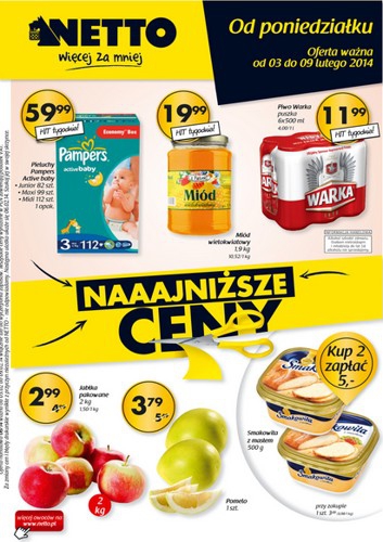 {loadposition linkNetto} Nowa gazetka promocyjna Netto - "Naaajniższe ceny". Polecane promocje z gazetki Netto: Pieluchy Pampers Active Baby - 59,99 zł. Miód wielokwiatowy 1,9 kg - 19,99 zł. Smakowita z masłem 500 g 2 sztuki - 5 zł.…