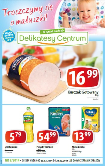 {loadposition linkDelikatesyCentrum} Nowa gazetka promocyjna Delikatesów Centrum - "Troszczymy się o maluszki!". Polecane promocje z gazetki Delikatesów Centrum: Kurczak gotowany 1 kg - 16,99 zł. Olej Kujawski 1 L - 5,79 zł. Pieluchy Pampers Active Baby - 54,99 zł.…