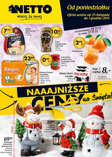 {loadposition linkNetto} Nowa gazetka promocyjna Netto - "Naaajniższe ceny na Święta!". Polecane promocje z gazetki Netto: Mandarynki 1 kg - 2,99 zł. Pieluchy Pampers Sleep&Play - 23,89 zł. Szynka konserwowa Sokołów 455 g - 7,77 zł. Oferta…