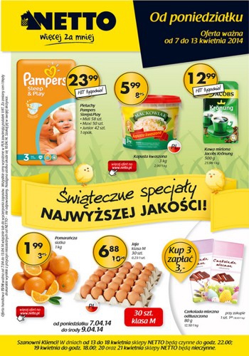 {loadposition linkNetto} Nowa gazetka promocyjna Netto - "Świąteczne specjały najwyższej jakości!". Polecane promocje z gazetki Netto: Pieluchy Pampers Sleep&Play - 23,99 zł. Pomarańcze 1 kg - 1,99 zł. Jaja klasa M 30 sztuk - 6,88 zł. Oferta…
