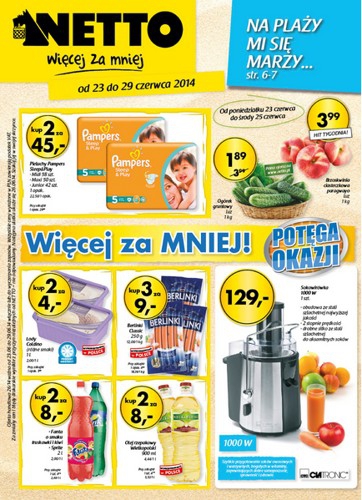 {loadposition linkNetto} Nowa gazetka promocyjna Netto - "Więcej za mniej!". Polecane promocje z gazetki Netto: Pieluchy Pampers Sleep&Play 2 opakowania - 45 zł. Sokowirówka 1000 W - 129 zł. Parówki Berlinki Classic 3x250 g - 9 zł. …