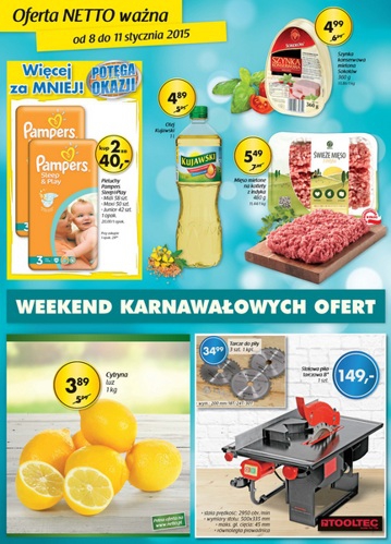 {loadposition linkNetto} Nowa gazetka promocyjna Netto - "Weekend karnawałowych ofert". Polecane promocje z gazetki Netto: Pieluchy Pampers Sleep&Play 2 opakowania - 40 zł. Olej Kujawski 1 L - 4,89 zł. Cytryny 1 kg - 3,89 zł. Oferta…