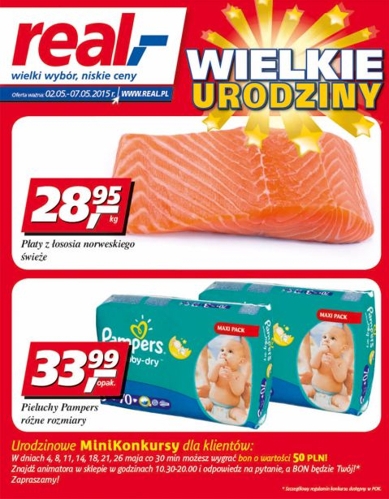 Nowa gazetka promocyjna sieci handlowej Real - "Wielkie urodziny". Polecane promocje z gazetki Real: Świeże płaty z łososia norweskiego 1 kg - 28,95 zł. Pieluchy Pampers - 33,99 zł. Ćwiartka z kurczaka 1 kg - 3,35 zł. …