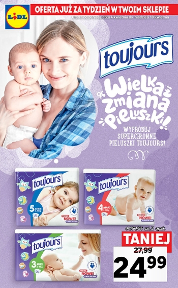 {loadposition linkLidl} Nowa gazetka promocyjna Lidl - "Wielka zmiana pieluszki!". Polecane promocje z gazetki Lidl: Pieluszki Toujours - 24,99 zł. Mleko następne Bebiprima 500 g - 19,99 zł. Danie Bebiprima 220 g - 4,49 zł. Oferta ważna od…