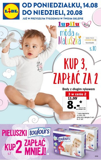 {loadposition linkLidl} Nowa gazetka promocyjna sieci sklepów Lidl - "Moda dla maluszka". Polecane promocje z gazetki sklepów Lidl: Body z długim rękawem 3 sztuki - 24 zł. Pieluszki Toujours Maxi 2x50 sztuk - 37,98 zł. Chusteczki nawilżone dla…