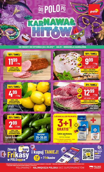 'Karnawał hitów' - nowa gazetka promocyjna sieci sklepów Polo Market. Polecane promocje z gazetki Polo Market: Kiełbasa żywiecka Madej Wróbel 1 kg - 11,99 zł. Pierś z kurczaka 1 kg - 9,99 zł*. Cytryny 1 kg - 4,99 zł.…
