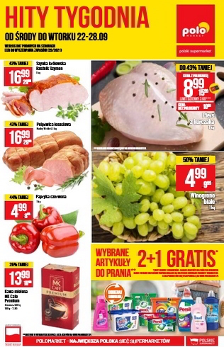 {loadposition linkPoloMarket} 'Hity tygodnia' - nowa gazetka promocyjna sieci sklepów Polo Market. Polecane promocje z gazetki Polo Market: Pierś z kurczaka 1 kg - 8,99 zł*. Winogrono ciemne 1 kg - 3,99 zł. Kiełbasa francuska Olewnik 1 kg -…