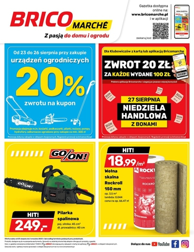 Nowa gazetka promocyjna sieci sklepów Bricomarche. Polecane promocje z gazetki Bricomarche: Pilarka spalinowa GO/ON! - 249 zł. Wełna skalna Rockroll Rockwool 150 mm m² - 19,99 zł. Nożyce do żywopłotu GO/ON! - 139 zł. Ponadto od 10 do…