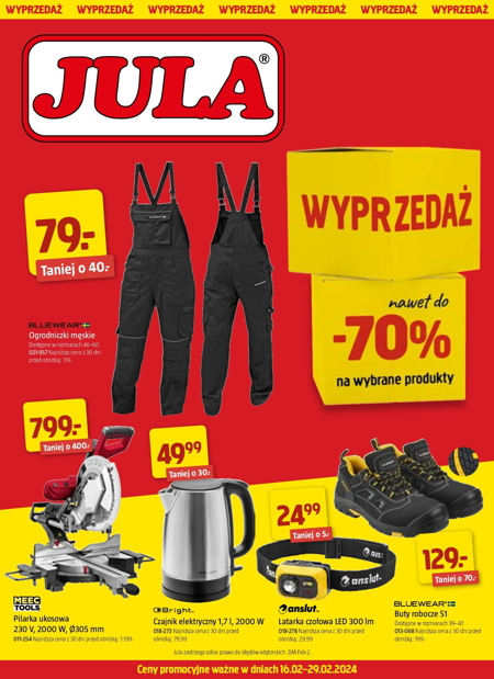 'Wyprzedaż nawet do -70% na wybrane produkty' - nowa gazetka promocyjna sieci marketów Jula. Polecane promocje z gazetki Jula Ogrodniczki męskie Bluewear - 79 zł. Pilarka ukosowa Meec Tools 2000 W - 799 zł. Czajnik elektryczny Bright - 49,99…