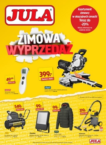 {loadposition linkJula2} 'Zimowa wyprzedaż. Asortyment zimowy w okazyjnych cenach! Teraz do -20%' - nowa gazetka promocyjna sieci handlowej Jula. Polecane promocje z gazetki Jula: Pilarka ukosowa Scheppach 2000 W - 399 zł. Kompresor Stanley 50 L 1500 W -…