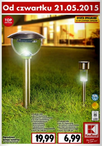 {loadposition linkKaufland} Nowa gazetka promocyjna marketu Kaufland - "TOP-Artykuł". Polecane promocje z gazetki Kaufland: Ogrodowa lampa solarna 1 dioda LED - 6,99 zł. Książeczka dla dzieci z naklejkami - 1,99 zł. Piłka nożna Puma Evoforce - 39,99 zł. …