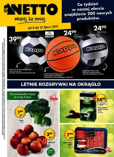 {loadposition linkNetto} Nowa gazetka promocyjna Netto - "Letnie rozgrywki na okrągło". Polecane promocje z gazetki Netto: Piłka nożna Kappa - 39,99 zł. Piłka koszykowa Kappa - 24,99 zł. Piłka siatkowa Kappa - 24,99 zł. Oferta ważna od…