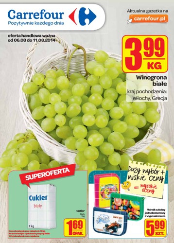 {loadposition linkCarrefour} Nowa gazetka promocyjna sieci handlowej Carrefour. Polecane promocje z gazetki Carrefour: Winogrono białe 1 kg - 3,99 zł. Cukier biały 1 kg - 1,69 zł. Piórnik szkolny jednokomorowy z wyposażeniem - 5,99 zł. Oferta ważna od…