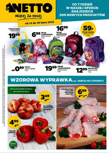 {loadposition linkNetto} Nowa gazetka promocyjna Netto - "Wzorowa wyprawka". Polecane promocje z gazetki Netto: Plecak szkolny - 59,99 zł. Plecak przedszkolny - 16,99 zł. Piórnik z wyposażeniem - 19,99 zł. Oferta ważna od 13.07 do 19.07.