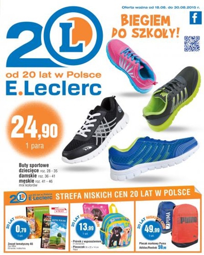 {loadposition linkEleclerc} Nowa gazetka promocyjna sieci handlowej E.Leclerc - "Powrót do szkoły 2015". Polecane promocje z gazetki E.Leclerc: Buty sportowe - 24,90 zł. Zeszyt tematyczny A5 - 0,79 zł. Piórnik z wyposażeniem - 13,99 zł. Oferta ważna od…