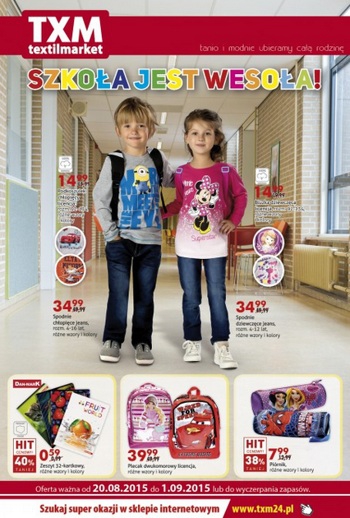 {loadposition linkTXM} Nowa gazetka promocyjna Textil Market - "Szkoła jest wesoła!". Polecane promocje z gazetki Textil Market: Podkoszulek chłopięcy - 14,99 zł. Bluzka dziewczęca - 14,99 zł. Piórnik - 7,99 zł. Oferta ważna od 20.07 do 1.09 lub…