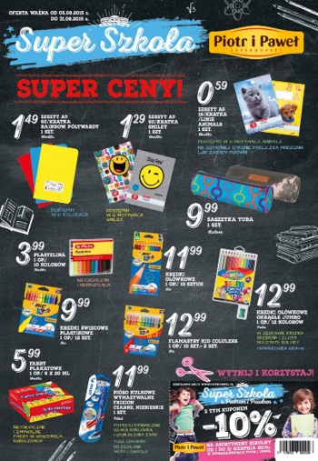 Nowa gazetka promocyjna sieci sklepów Piotr i Paweł - "Super szkoła". Polecane promocje z gazetki Piotr i Paweł: Plastelina 10 kolorów - 3,99 zł. Farby plakatowe 6x20 ml - 5,99 zł. Pióro kulkowe wymazywalne Frixion - 11,99 zł.…