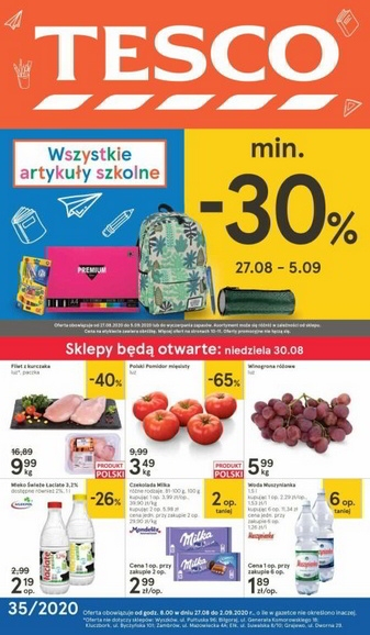 Nowy katalog sieci handlowej Tesco - "Na każde szkolne wyzwanie". Polecane promocje z katalogu Tesco: Plecak szkolny - 49,99 zł. Pióro kulkowe wymazywalne Frixion - 10,99 zł. Kredki grube Jumbo TESCO Go Create 14 kolorów - 8,99 zł.…