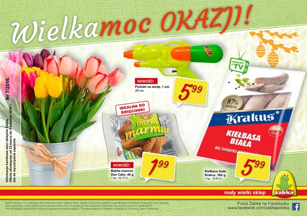 Nowa gazetka promocyjna sieci sklepów Żabka - "Wielkamoc okazji!". Polecane promocje z gazetki Żabka: Pistolet na wodę - 5,99 zł. Babka marmur Dan Cake 40 g - 1,99 zł. Kiełbasa biała Krakus 360 g - 5,99 zł. …