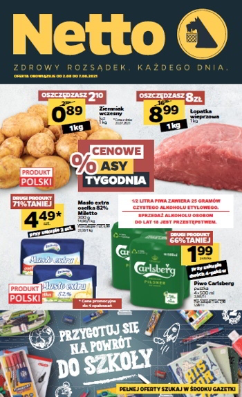 {loadposition linkNetto} 'Cenowe asy tygodnia' - nowa gazetka promocyjna sieci sklepów Netto. Polecane promocje z gazetki Netto: Ziemniaki wczesne 1 kg - 0,89 zł. Łopatka wieprzowa 1 kg - 8,99 zł. Piwo Carlsberg 8x500 ml - 15,92 zł. …