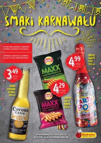 {loadposition linkBiedronka} Nowa gazetka promocyjna sieci handlowej Biedronka - "Smaki karnawału". Polecane promocje z gazetki sieci Biedronka: Piwo Corona Extra 350 ml - 29,99 zł. Chipsy Lay's Max 230 g - 4,29 zł. Napój Party Pop 750 ml -…