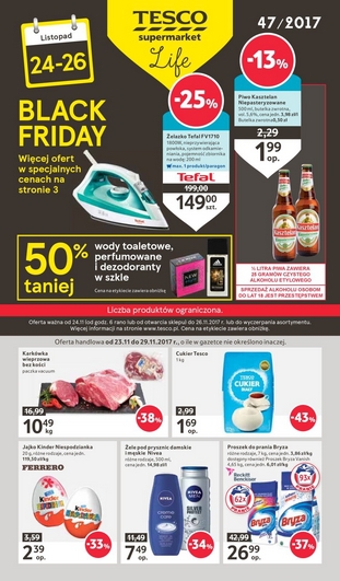 Nowa gazetka promocyjna sieci sklepów Tesco - "Black Friday". Polecane promocje z gazetki Tesco: Żelazko Tefal FV1710 - 149 zł. Piwo Kasztelan Niepasteryzowane 500 ml - 1,99 zł. Cukier Tesco 1 kg - 1,69 zł. …