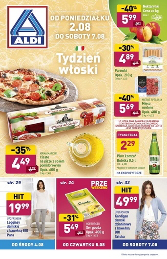 {loadposition linkAldi2} 'Tydzień włoski' - nowa gazetka promocyjna sieci sklepów Aldi. Polecane promocje z gazetki Aldi: Ciasto na pizzę z sosem pomidorowym Mama Mancini 600 g - 4,49 zł. Nektarynki 1 kg - 5,99 zł. Piwo Łomża 500 ml…