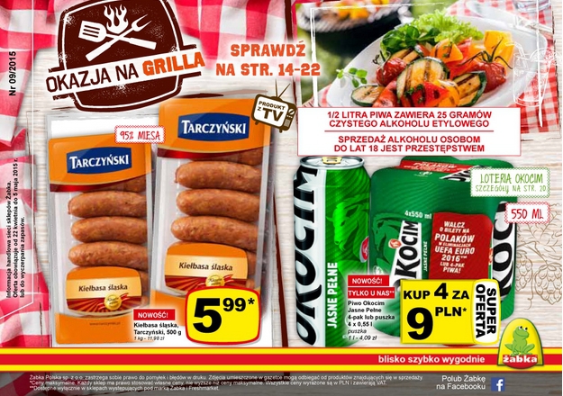 Nowa gazetka promocyjna sieci sklepów Żabka - "Okazja na grilla". Polecane promocje z gazetki Żabka: Kiełbasa śląska Tarczyński 500 g - 5,99 zł. Piwo Okocim Jasne Pełne 4x500 ml - 9 zł. Donut z cukrem 50 g -…