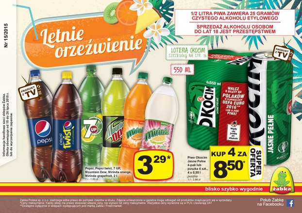 Nowa gazetka promocyjna sieci sklepów Żabka - "Za cenowy rok!". Polecane promocje z gazetki Żabka: Piwo Okocim Jasne Pełne 4x550 ml - 9,50 zł. Chipsy Crunchips 140 g - 3,29 zł. Pepsi, Pepsi Max, Pepsi Light, Pepsi Twist…