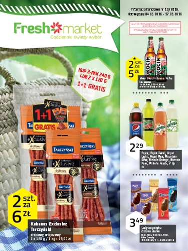 {loadposition linkFreshmarket} Nowa gazetka promocyjna Freshmarket. Polecane promocje z gazetki Freshmarket: Kabanos Exclusive Tarczyński 2x120 g - 6 zł. Piwo Okocim Jasne Pełne 2x500 ml - 5 zł. Lody na patyku Zielona Budka 100 ml - 3,49 zł. …