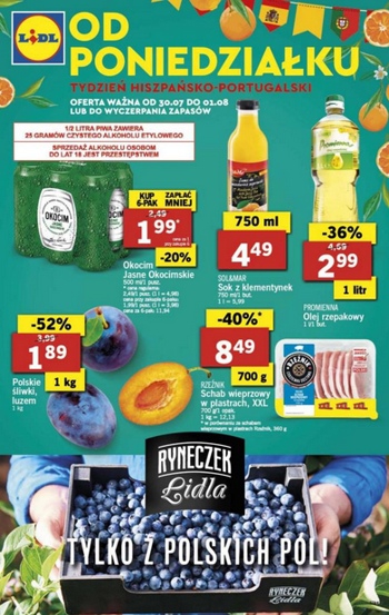 {loadposition linkLidl1} 'Od poniedziałku tydzień hiszpańsko-portugalski' - nowa gazetka promocyjna sieci sklepów Lidl. Polecane promocje z gazetki sklepów Lidl: Piwo Okocim 6x500 ml - 11,94 zł. Sok z klementynek Sol&Mar 750 ml - 4,49 zł. Olej rzepakowy Promienna 1…