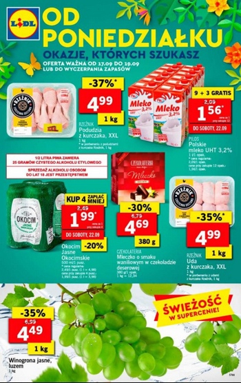 {loadposition linkLidl1} 'Od poniedziałku okazje, których szukasz' - nowa gazetka promocyjna sieci sklepów Lidl. Polecane promocje z gazetki sklepów Lidl: Podudzia z kurczaka Rzeźnik 1 kg - 4,99 zł. Piwo Okocim Jasne Okocimskie 4x500 ml - 7,96 zł.…