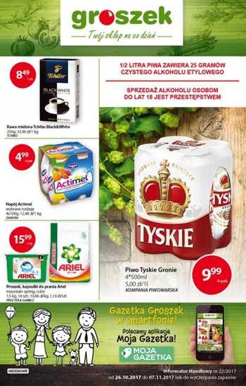 {loadposition linkGroszek} Nowa gazetka promocyjna sieci sklepów Groszek. Polecane promocje z gazetki Groszek: Piwo Tyskie Gronie 4x500 ml - 9,99 zł. Kawa mielona Tchibo Black&White 250 g - 8,49 zł. Napój Danone Actimel 4x100 g - 4,99 zł.…