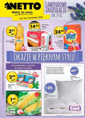 {loadposition linkNetto} Nowa gazetka promocyjna Netto - "Okazje w pięknym stylu". Polecane promocje z gazetki Netto: Olej słonecznikowy Ollineo 1 L - 3,85 zł. Piwo Warka 8x500 ml - 14,32 zł. Masło Ekstra 200 g - 2,99 zł.…