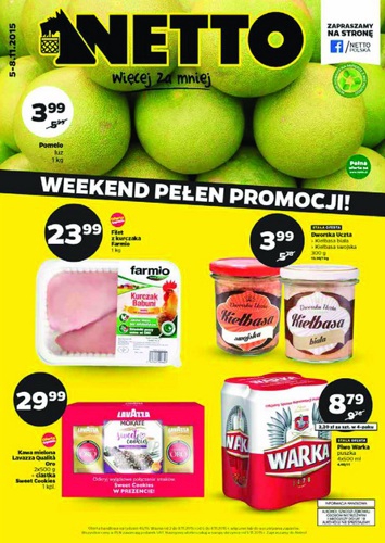 {loadposition linkNetto} Nowa gazetka promocyjna Netto - "Weekend pełen promocji!". Polecane promocje z gazetki Netto: Filet z kurczaka Farmio 1 kg - 23,99 zł. Piwo Warka 4x500 ml - 8,79 zł. Parówki Jedynki Classic 200 g - 2,99…