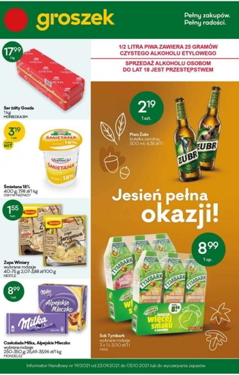 {loadposition linkGroszek} 'Jesień w pełni' - nowa gazetka promocyjna sieci sklepów Groszek. Polecane promocje z gazetki Groszek: Piwo Żubr 500 ml - 2,19 zł. Ser żółty Złoty Mazur SM Mlekpol 1 kg - 19,59 zł. Majonez Winiary 400 ml…