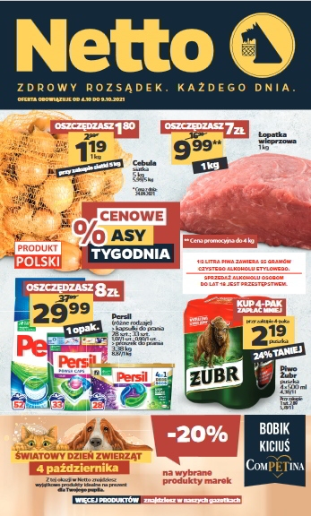 {loadposition linkNetto3} 'Cenowe asy tygodnia' - nowa gazetka promocyjna sieci sklepów Netto. Polecane promocje z gazetki Netto: Cebula 1 kg - 1,19 zł. Łopatka wieprzowa 1 kg - 9,99 zł. Piwo Żubr 4x500 ml - 8,76 zł. …