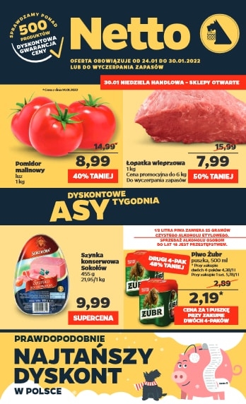 {loadposition linkNetto} 'Dyskontowe asy tygodnia' - nowa gazetka promocyjna sieci sklepów Netto. Polecane promocje z gazetki Netto: Pomidory malinowe 1 kg - 8,99 zł. Łopatka wieprzowa 1 kg - 7,99 zł. Piwo Żubr 4x500 ml - 8,76 zł. …
