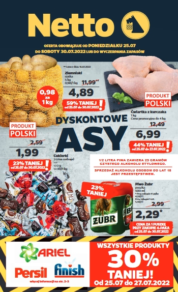{loadposition linkNetto} 'Dyskontowe asy' - nowa gazetka promocyjna sieci sklepów Netto. Polecane promocje z gazetki Netto: Jabłka 1 kg - 1,99 zł. Olej rzepakowy Beskidzki Bielmar 2x1 L - 17,98 zł. Piwo Żubr 8x500 ml - 18,32 zł*. …